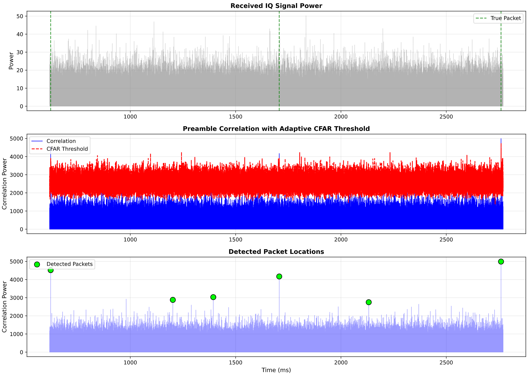 - Bottom plot: Detected packets highlighted as peaks above threshold