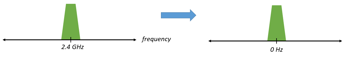 Revenons maintenant à l’échantillonnage pour une seconde. Au lieu de recevoir des échantillons en multipliant ce qui provient de l’antenne par un cos() et un sin() puis en enregistrant I et Q, que se passerait-il si nous envoyions le signal de l’antenne dans un seul CAN, comme dans l’architecture d’échantillonnage direct dont nous venons de parler? Supposons que la fréquence porteuse soit de 2.4 GHz, comme le WiFi ou le Bluetooth. Cela signifie que nous devrions échantillonner à 4.8 GHz, comme nous l’avons appris. C’est extrêmement rapide! Un CAN qui échantillonne aussi rapidement coûte des milliers de dollars. Au lieu de cela, nous “descendons en fréquence” (downconversion en anglais) le signal pour que le signal que nous voulons échantillonner soit centré sur le courant continu ou 0 Hz. Cette descente en fréquence a lieu avant l’échantillonnage. Nous passons de: