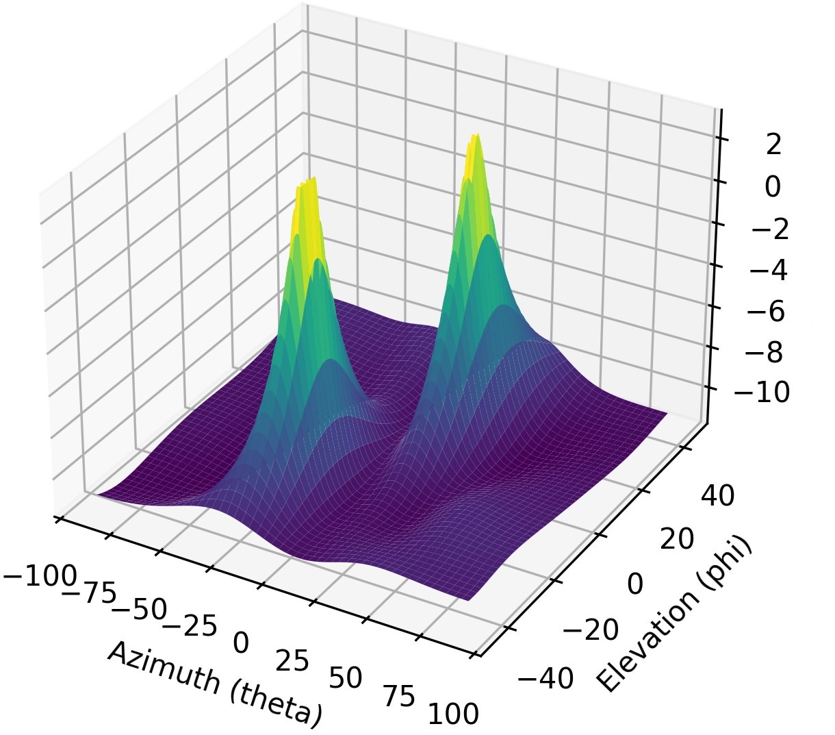 Наші результати двовимірні, адже решітка теж 2D, тому нам доведеться використати або 3D-графік, або 2D-теплокарту. Спробуймо обидва. Спочатку побудуємо 3D-графік, де на одній осі буде кут місця, а на іншій — азимут: