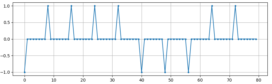 Applying 8 samples per symbol: [-1, 0, 0, 0, 0, 0, 0, 0, 1, 0, 0, 0, 0, 0, 0, 0, 1, 0, 0, 0, 0, 0, 0, 0, ...]