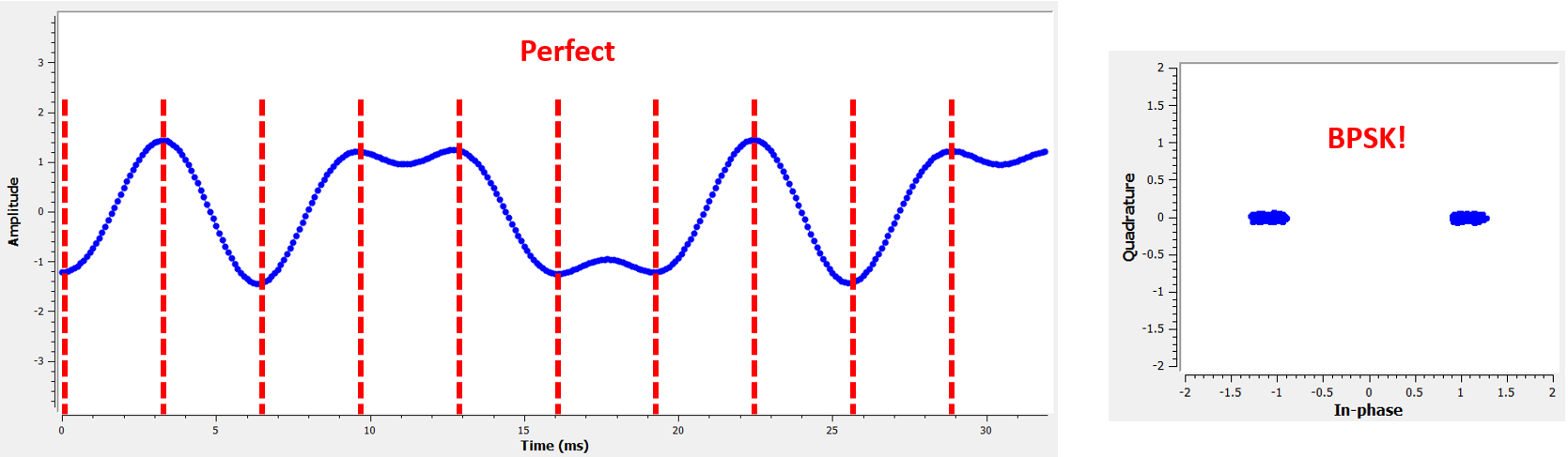 下面是一个使用 GNU Radio 创建的示例,它展示了在正确和错误的时刻采样时 IQ 图(即星座图)的样子。原始脉冲的比特值已标注在图上。
