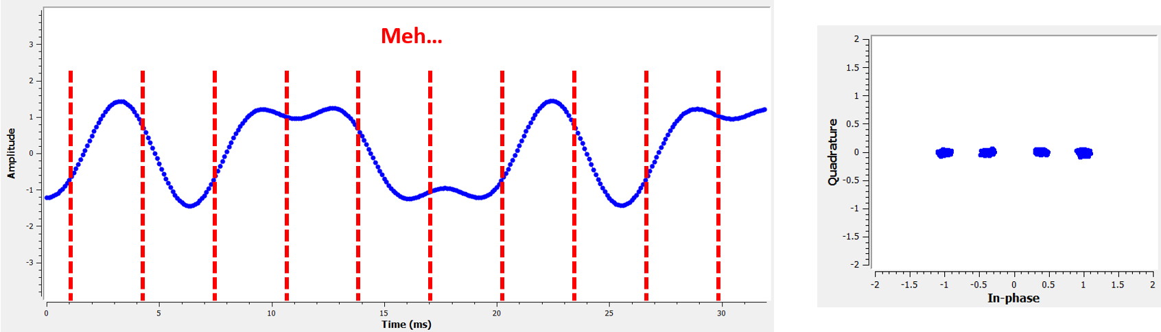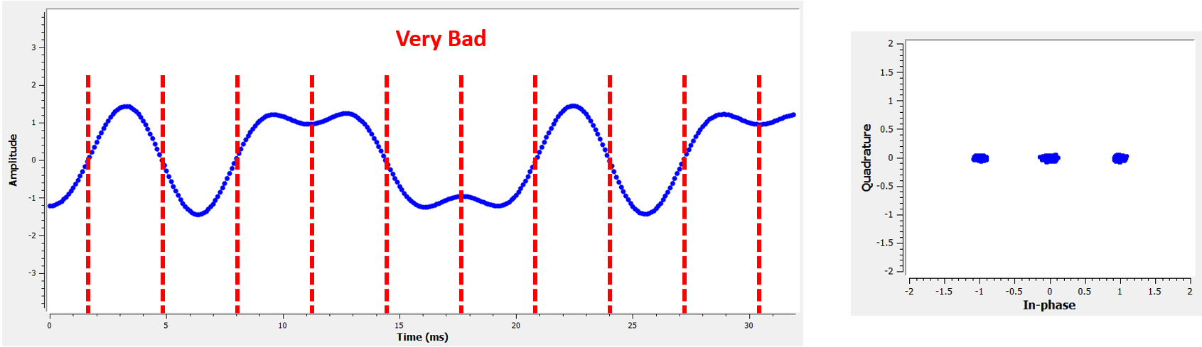 与之对比,下图展示了最差的采样时刻。注意星座图中出现了三个聚类。我们恰好在每两个符号的正中间进行采样,因此采样值会有很大偏差。